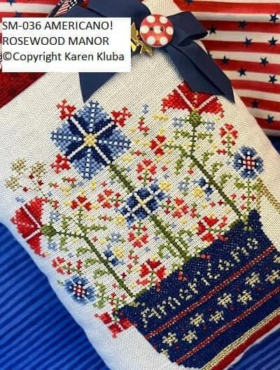DMC: 321, 469, 470, 471, 666, 796, 798, 809, 3801, 3822, Ecru