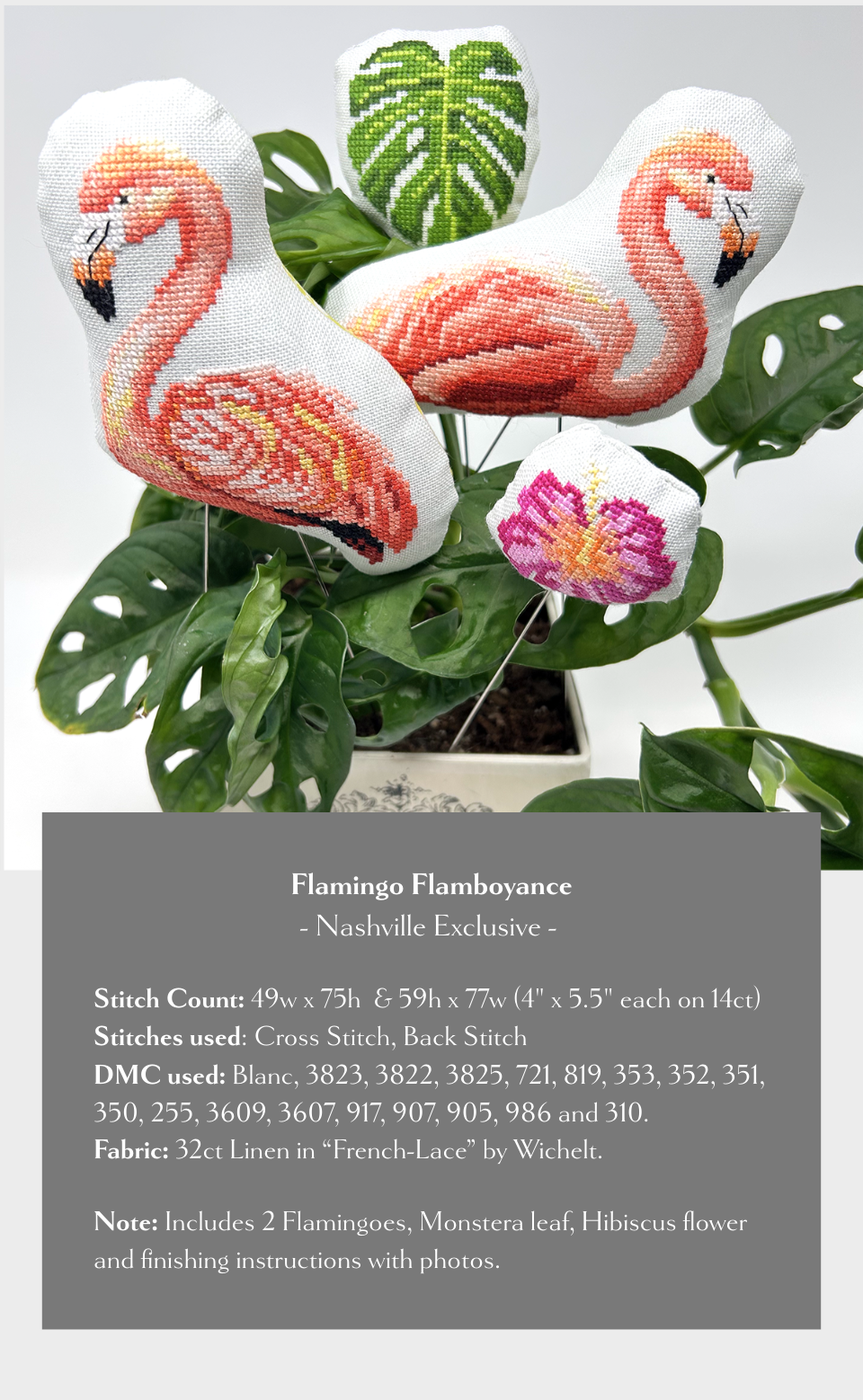 DMC: Blanc, 3823, 3822, 3825, 721, 819, 353, 352, 351, 350, 255, 3609, 3607, 917, 907, 905, 986, 310