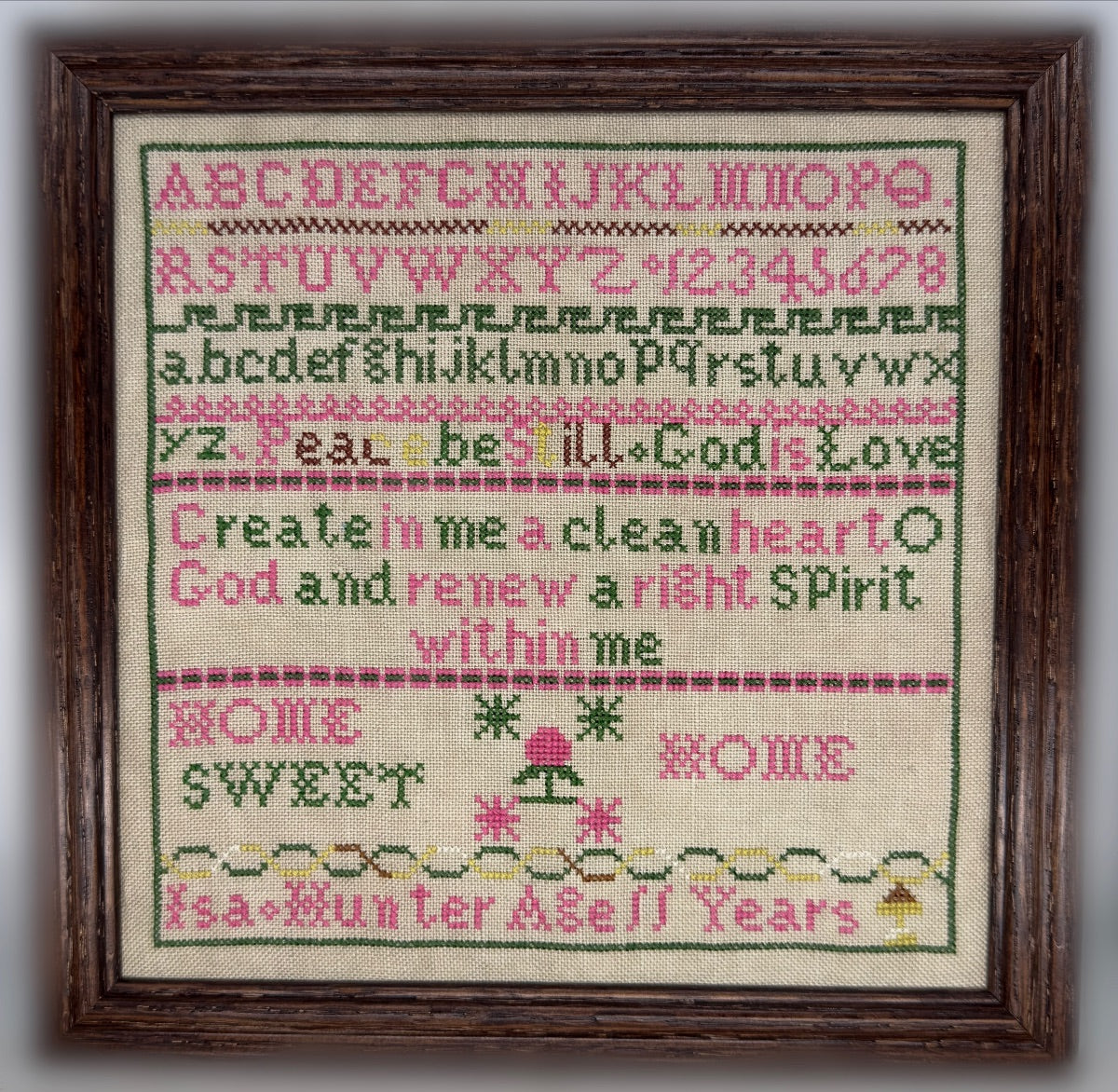 DMC: Ecru, 433, 602, 734, 895, 986, 3857